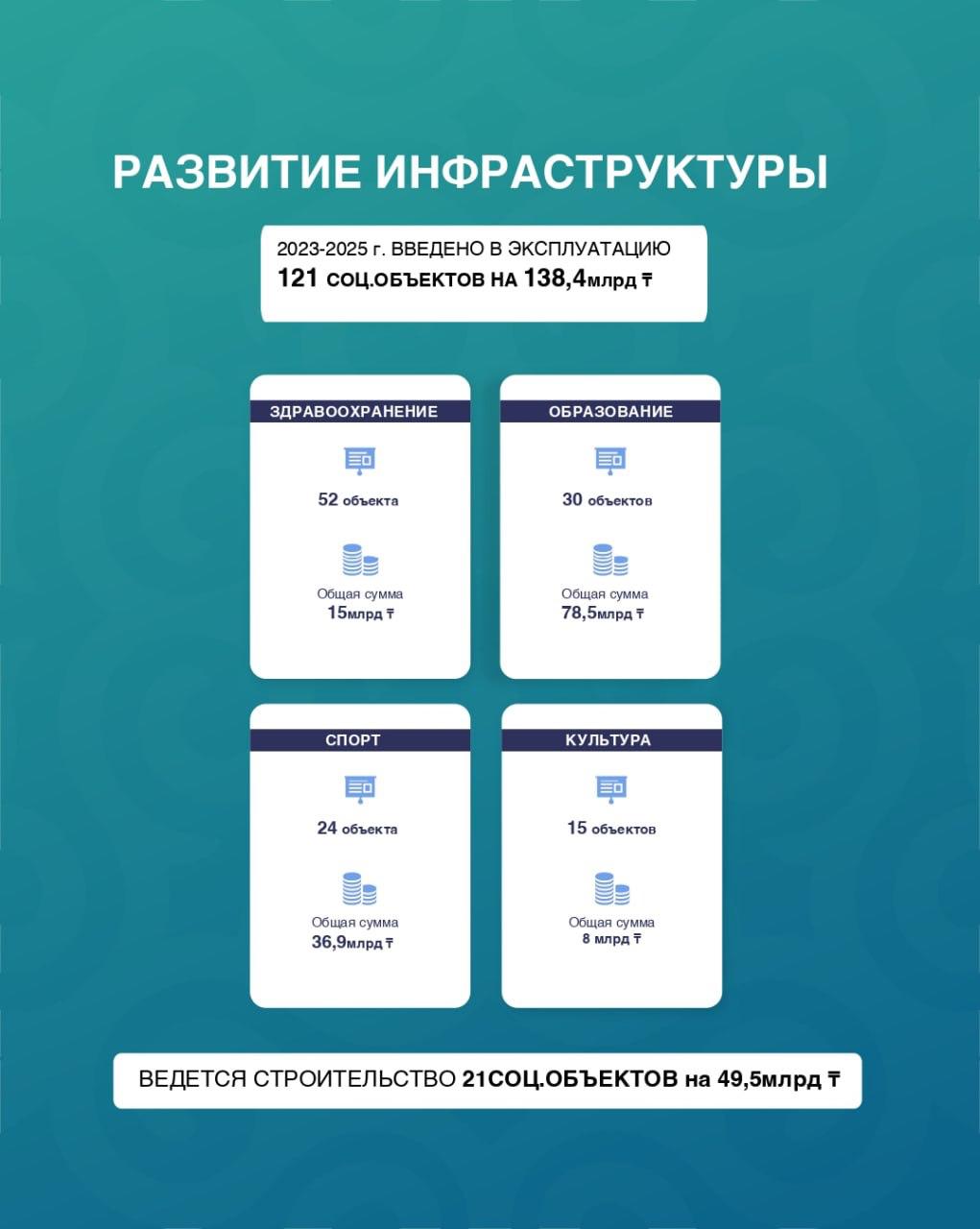 Сонымен қатар, қазіргі таңда облыс аумағында 21 әлеуметтік нысанның құрылысы жалғасуда. Аталған нысандар іске қосылғаннан кейін өңір тұрғындары үшін білім алу, медициналық қызмет көрсету, спортпен шұғылдану және мәдени демалыс мүмкіндіктері одан әрі кеңейе түседі.