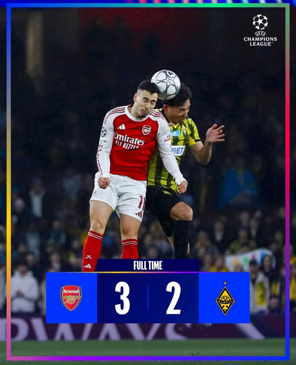 Алматылық «Қайрат» футбол клубы Чемпиондар Лигасындағы соңғы ойынын өткізіп, лондондық «Арсеналға» 2:3 есебімен есе жіберді, деп хабарлайды Zhaiyqmedia ақпарат агенттігі.