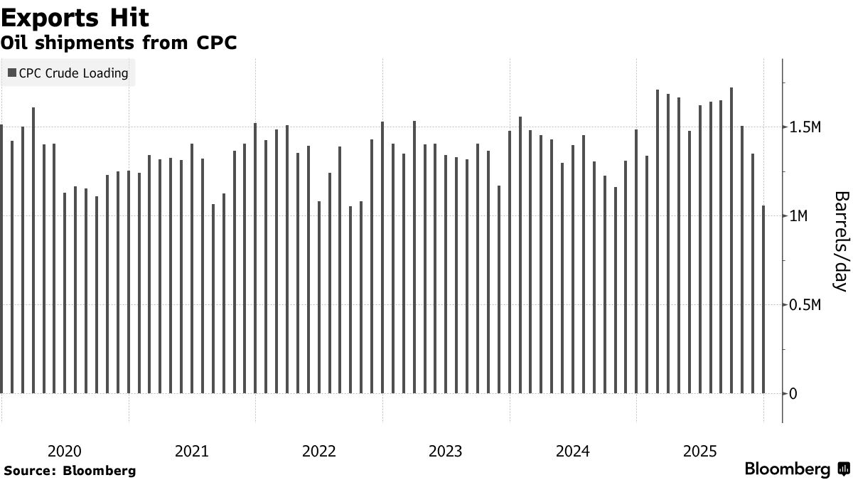 Bloomberg хабарлауынша, осы айда CPC Blend маркалы мұнайды жөнелту тәулігіне 800-900 мың баррельді құрайды. Бұл – желтоқсан айының ортасында күтілген көлемнен шамамен 45%-ға аз. Жүк тиеу кестесін бақылайтын трейдерлердің айтуынша, бастапқыда жөнелтуге жоспарланған қазақстандық 45 кеменің кемінде 21-інің сапары тоқтатылған.