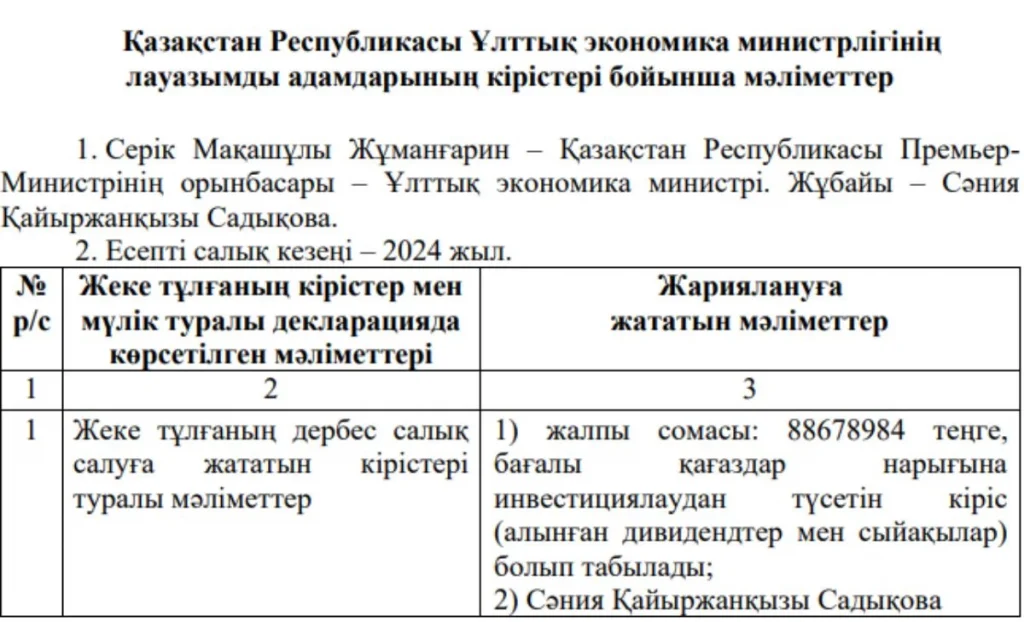 Дерек ұлттық экономика министрлігінің сайтында жарияланған. Декларацияға қарағанда, Сәния Садықова 2024 жылы биржадағы бағалы қағаздарға салған инвестицияларынан – дивиденд пен сыйақы түрінде 88 678 984 теңге тапқан.