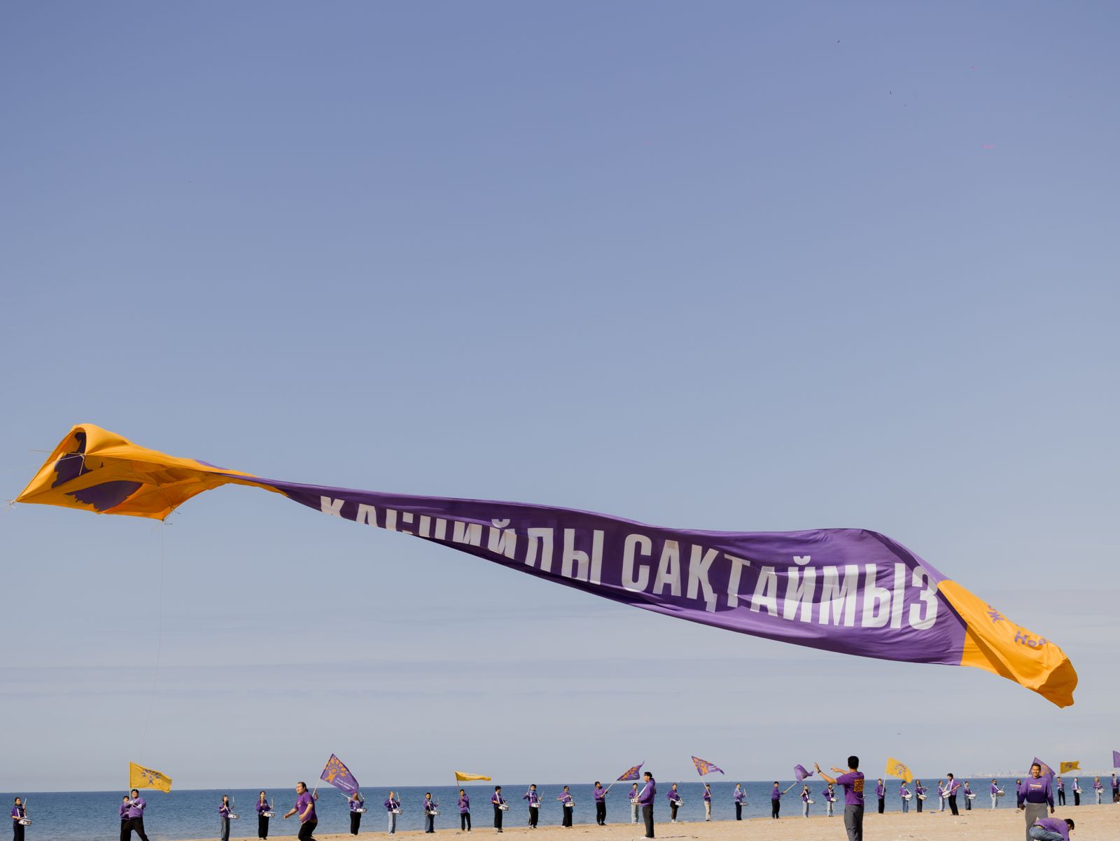 Над берегом активисты подняли огромный воздушный змей длиной 22 метра с надписью «Сохраним Каспий» — как обещание будущим поколениям и самим себе.