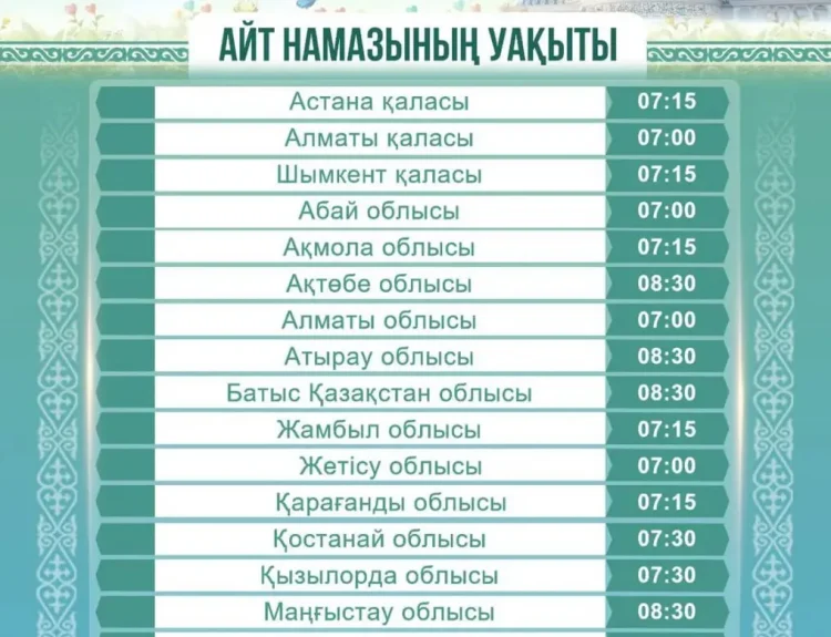 Қазақстан мұсылмандары діни басқармасы 10 сәуірде басталатын Ораза айт мерекесіне орай еліміздің барлық қаласы үшін айт намазының кестесін жариялады.